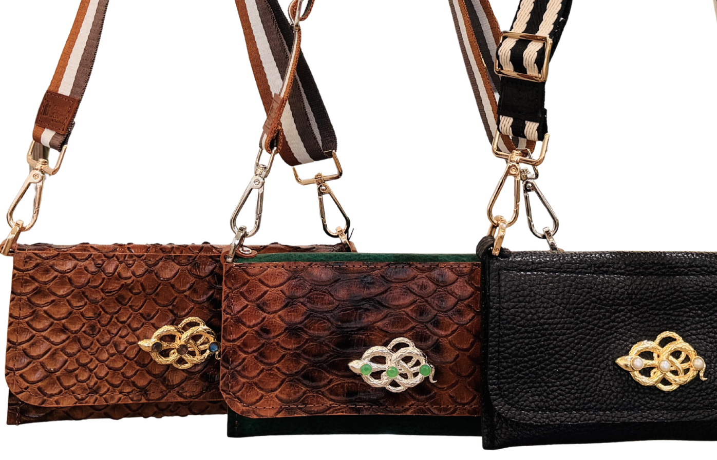 One-of-a-kind embossed leather crossbody bags featuring Le Serpent Bijoux Buckles.